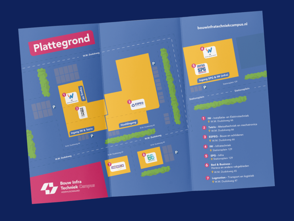 Voor Bouw Infra Techniek Campus ontwikkelden we een complete huisstijl. Het beeldmerk is ontworpen met een hoogspanningsicoon in negatieve ruimte, wat staat voor kracht, energie en verbinding. De afzonderlijke elementen functioneren als bouwstenen, waardoor ze flexibel inzetbaar zijn binnen verschillende toepassingen en uitingen.